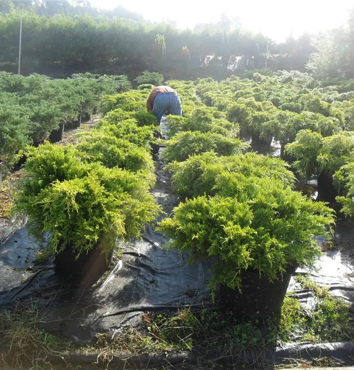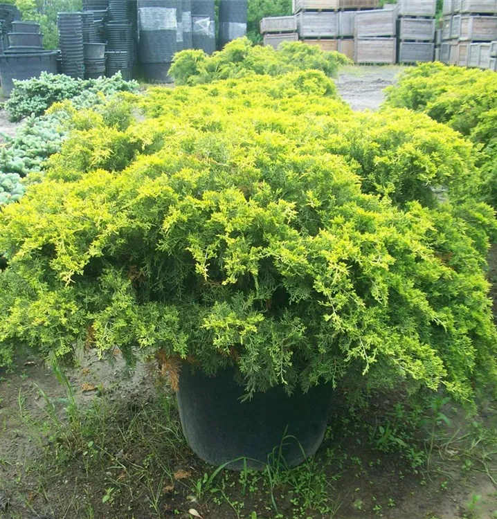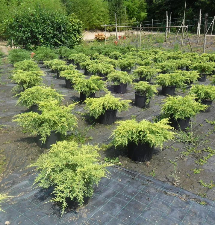 The Chinese juniper 'Old Gold' (Juniperus chinensis) is a small shrub that grows broad and compact and usually reaches a height of around 1 metre and a width of around 3 metres. Its scale-like leaves are golden yellow in colour. This shrub is well tolerant of frost and prefers well-drained soil in a sunny position.