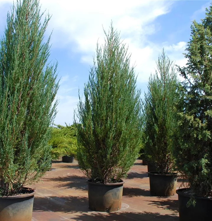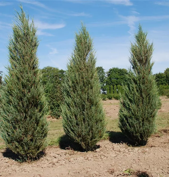 The Rocky Mountain juniper 'Blue Arrow' (Juniperus virginiana) is a large shrub that grows columnar and slender and usually reaches a height of around 5 metres and a width of around 1 metre. Its scale-like leaves are blue-grey in colour. This shrub is well tolerant of frost and prefers well-drained, humus-rich soil in a sunny position.