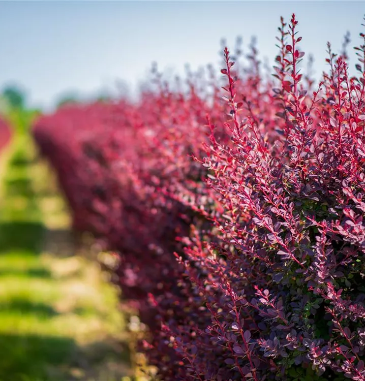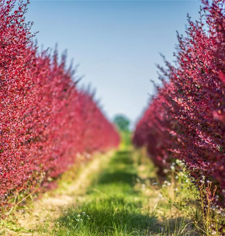 The Barberry 'Superba' (Berberis ottawensis) is a loose, overhanging shrub with decorative, light red, elongated fruits that stay on for a very long time. These are small. It produces yellow-red flowers arranged in umbels from May to June. The Barberry 'Superba' also bears roundish, dark red leaves. In a sunny to semi-shady location, it usually reaches a height of around 4 metres and is around 4 metres wide. The Barberry 'Superba' makes no special demands on the soil.