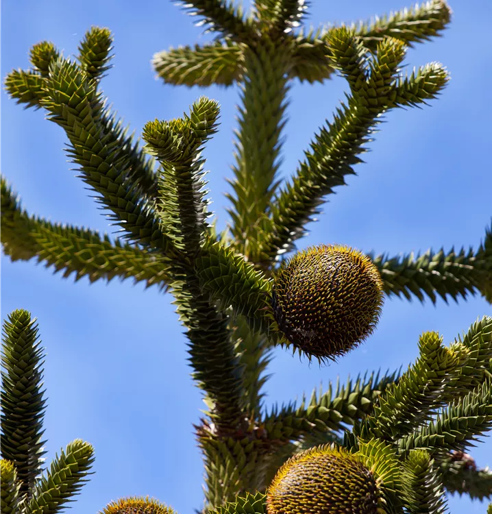 The Monkey puzzle (Araucaria araucana) is a tree that grows in a conical shape and usually reaches a height of around 35 metres and a width of around 8 metres. Its triangular, glossy, leathery leaves are dark green in colour. This shrub is well tolerant of frost and prefers well-drained, lime-free, loose, slightly acidic soil in a sunny to semi-shady position.