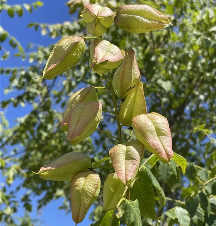 The Pride of India (Koelreuteria paniculata) is an upright, broad small tree with decorative, reddish-brown fruits that remain on the tree for a very long time. It produces yellow flowers arranged in panicles from July to August. The Pride of India also has pinnate, dark green leaves. The red shoots are also an interesting sight. In a sunny location, it usually reaches a height of around 8 metres and grows to a width of around 5 metres. The Pride of India makes no particular demands on the soil.