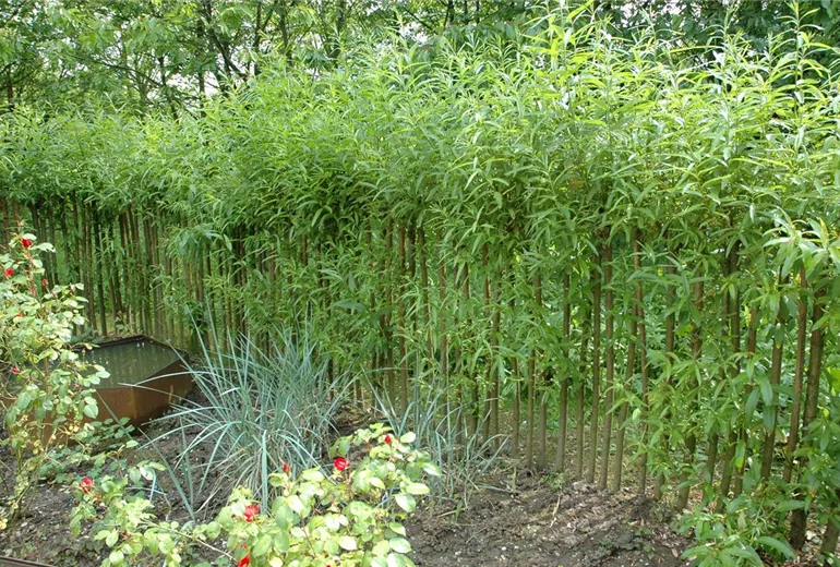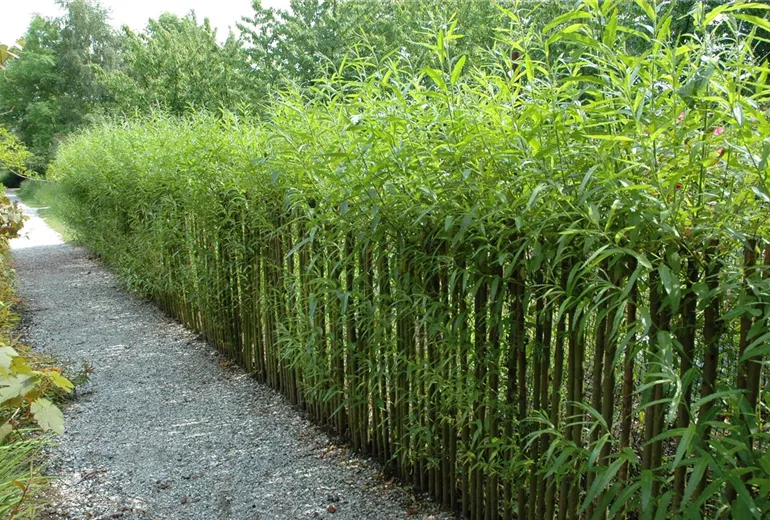 Living property boundaries or privacy screens can be beautifully created with various types of willows. The name "willow" refers to the high flexibility of the rods, as it is derived from the Indo-European word "ueie," meaning to bend, twist, or turn. In addition to the wood's good flexibility, willows are also characterized by fast and often straight growth.