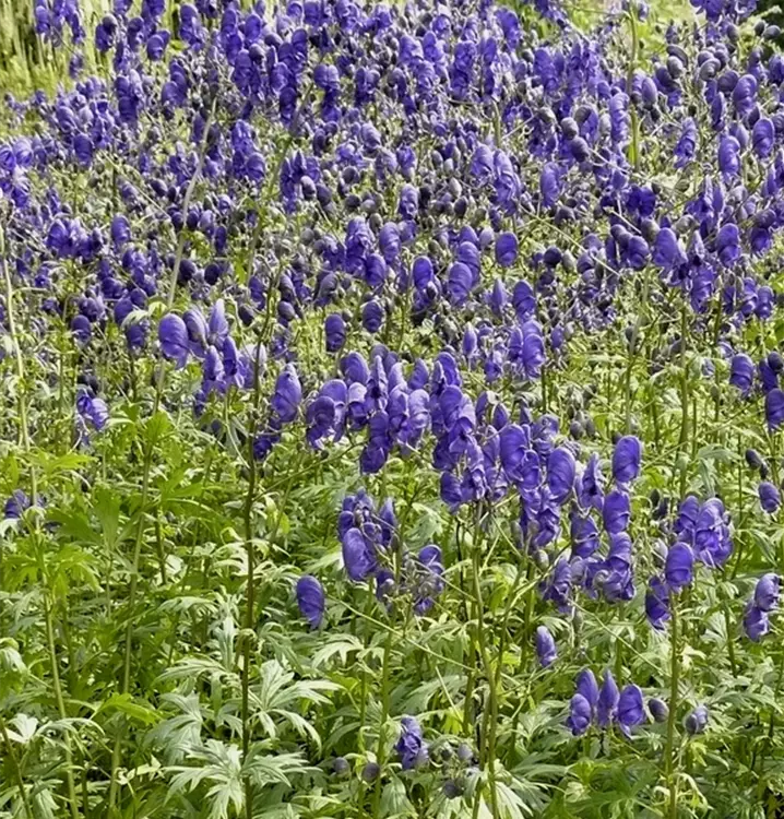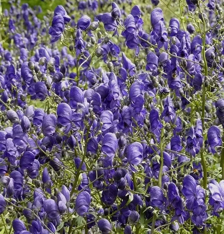 Aconitum napellus образует сине-фиолетовые цветки, расположенные в метелках с июля.