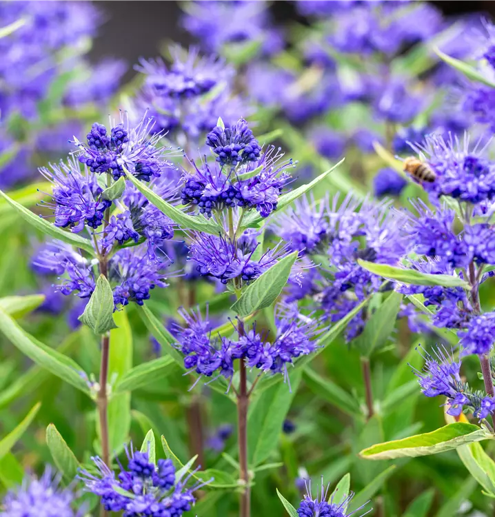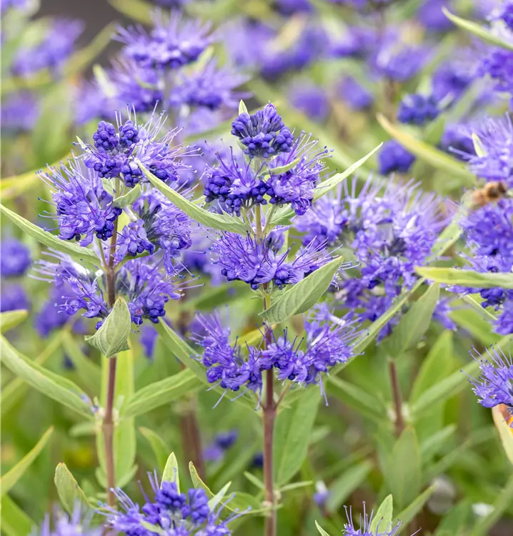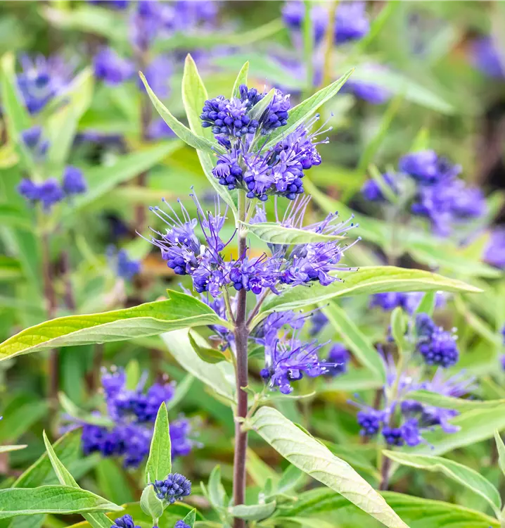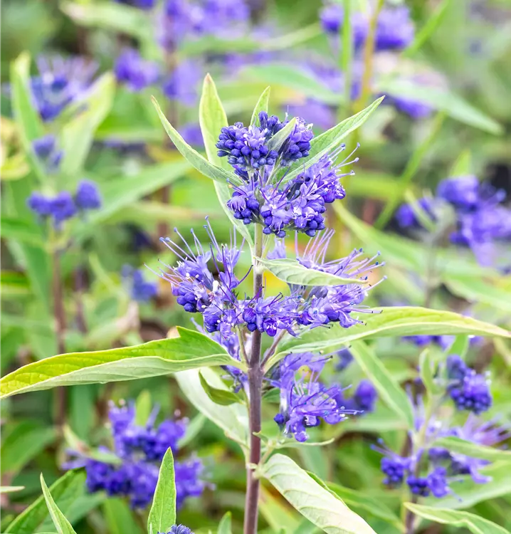 Кариоптерис кландонский Bartblume 'Kew Blue' (Caryopteris clandonensis) - это небольшой кустарник с темно-синими цветками с приятным ароматом. Они появляются с июля по сентябрь. У Bartblume 'Kew Blue' также матовые, ланцетные, темно-зеленые листья. На солнечном или полутенистом месте с хорошо дренированной, богатой питательными веществами почвой он обычно достигает высоты около 80 см и ширины около 50 см.