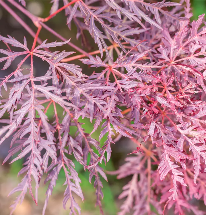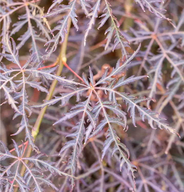 Клен пальчатый Fächerahorn 'Inaba-shidare' (Acer palmatum) - это приземистый, нависающий, листопадный кустарник с декоративными, глубоко рассеченными, темно-красными листьями. В мае у него появляются пурпурно-красные цветки, собранные в гроздья. Из них появляются красные крылатые плоды. На солнечном или полутенистом, защищенном от ветра месте с хорошо дренированной, богатой гумусом почвой он обычно достигает высоты около 2,5 м и разрастается в ширину примерно до 3 м.