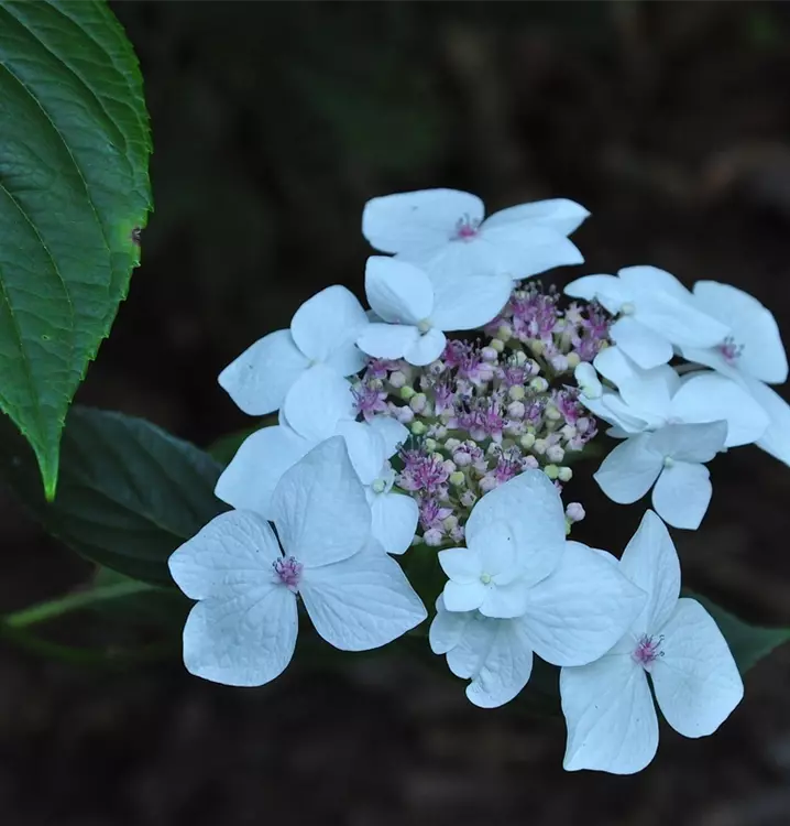 Листочки у Tellerhortensie 'Lanarth White' темно-зеленые, яйцевидные, пильчатые.