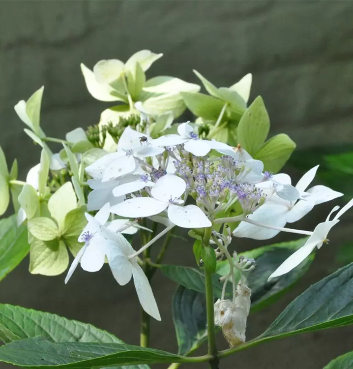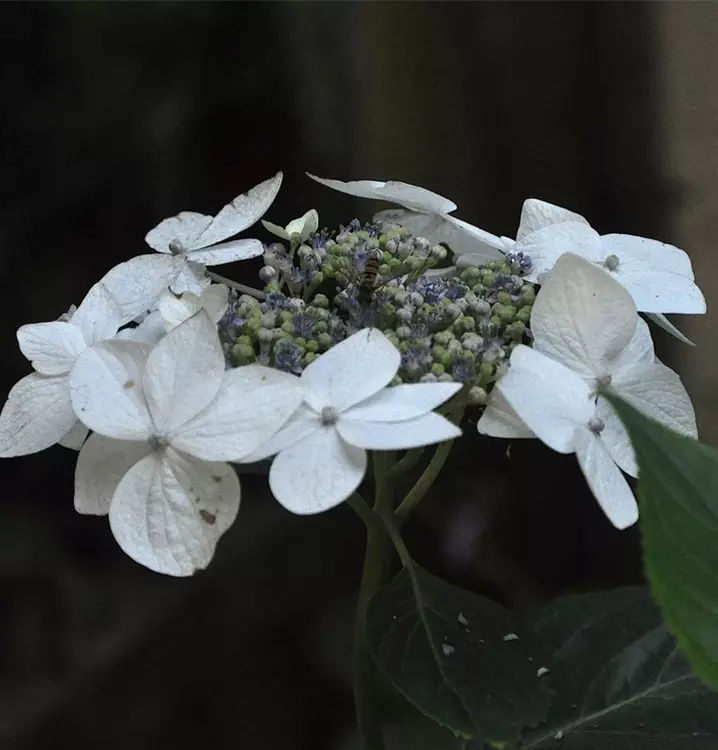 Белые, чашевидные цветки Tellerhortensie 'Lanarth White' появляются в зонтиках с июля по сентябрь.